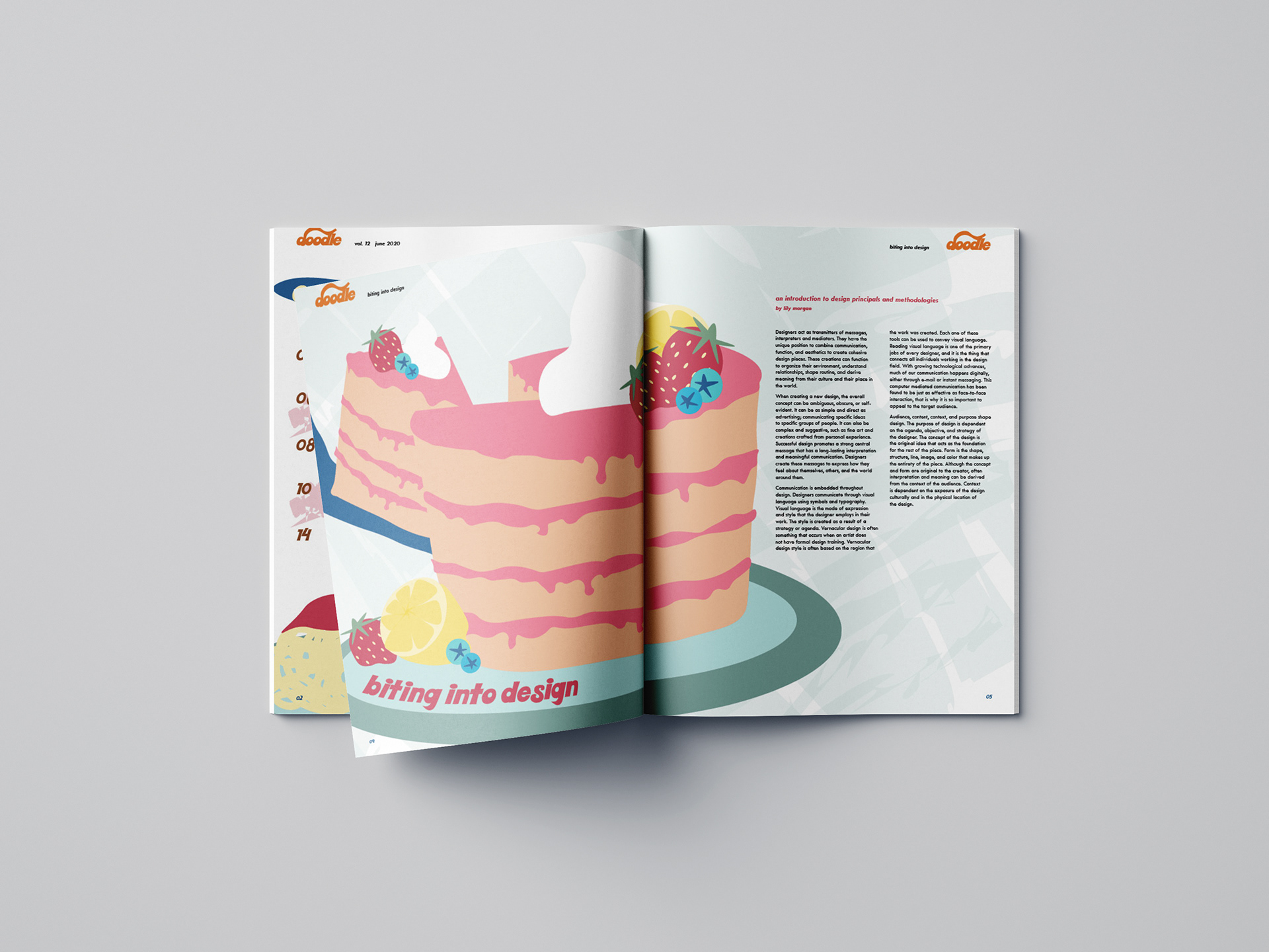 Doodle is an arts publication created for children and young adults who are interested in design and illustration. This month’s fictitious theme is Biting into Design, which features an introduction to design principals and methodologies. The magazine also includes an introduction to typographic design and anatomy of type in an article titled Alphabet Soup.